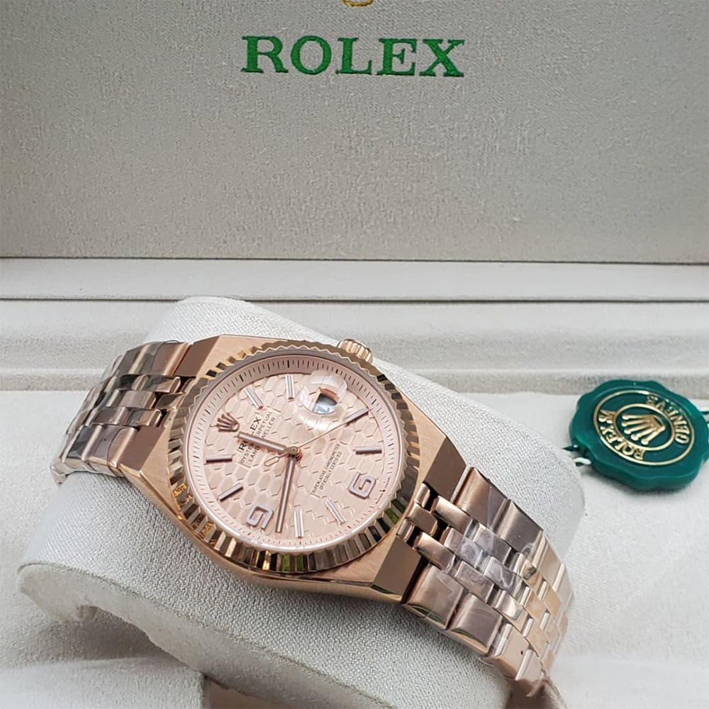 Cadran d’Exception : Le cadran rose se pare d’un motif géométrique en relief (nid d’abeille) qui joue avec la lumière, accompagné d’index bâtons et de chiffres arabes élégants.
